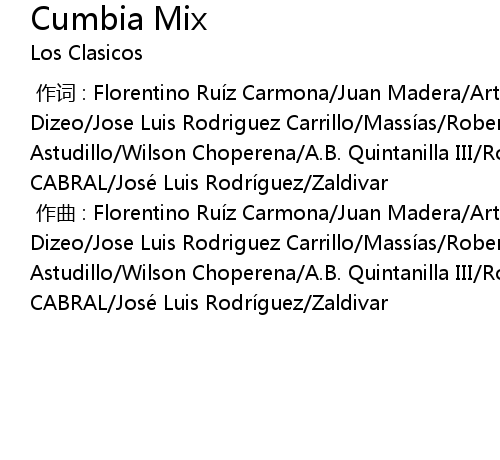 | [00:00.000] | 作词 : Florentino Ruíz Carmona/Juan Madera/Arturo C. Bassan/E. Dizeo/Jose Luis Rodriguez Carrillo/Massías/Roberto Ternán/Sidney Simien/Pete Astudillo/Wilson Choperena/A.B. Quintanilla III/Roberto Teran/Fito Olivares/A. CABRAL/José Luis Rodríguez/Zaldivar |