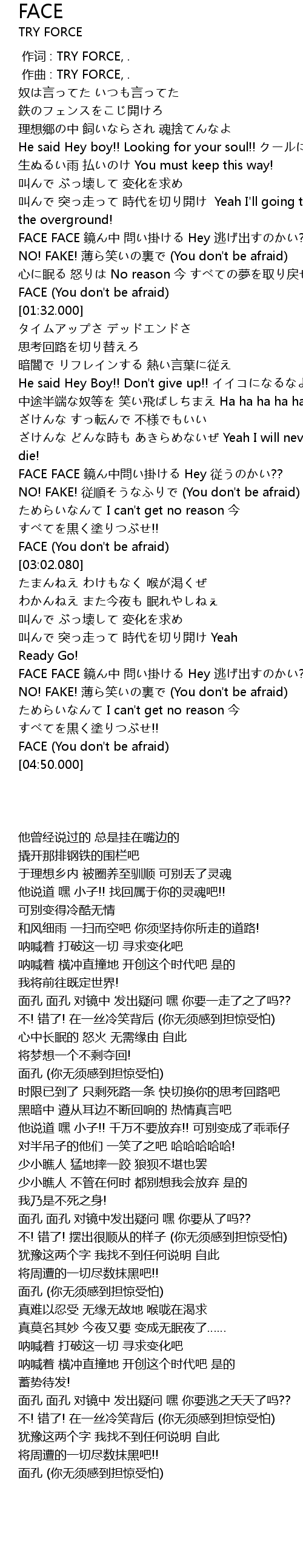 | [02:26.900] | FACE FACE 鏡ん中問い掛ける Hey 従うのかい?? |