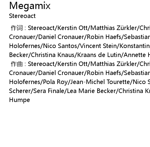 | [00:00.000] | zuò cí : Stereoact Kerstin Ott Matthias Zü rkler Christoph Cronauer Daniel Cronauer Robin Haefs Sebastian Seidel Rico Einenkel Judith Holofernes Nico Santos Vincent Stein Konstantin Scherer Sera Finale Lea Marie Becker Christina Knaus Kraans de Lutin Annette Humpe |