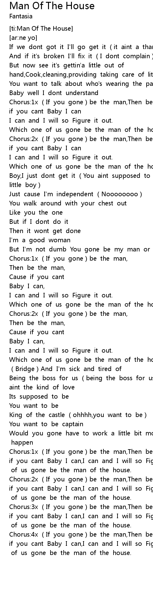 | [02:54.813] | Chorus: 4x If you gone be the man, Then be the man, Cause if you cant Baby I can, I can and I will so Figure it out. Which one of us gone be the man of the house. |