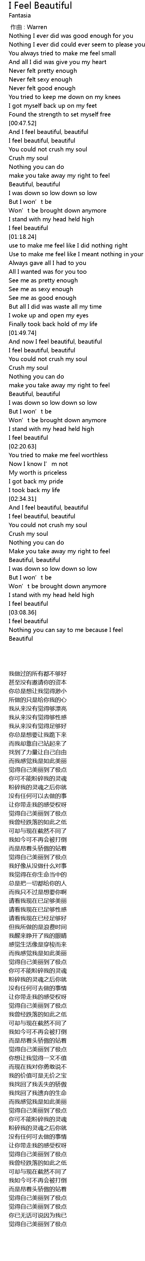 | [03:08.70] | I feel beautiful |