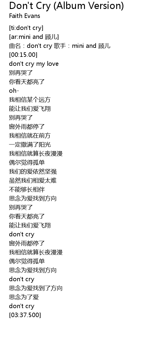 | [00:03.60] | 曲名:don't cry 歌手:mini and 顾儿 |