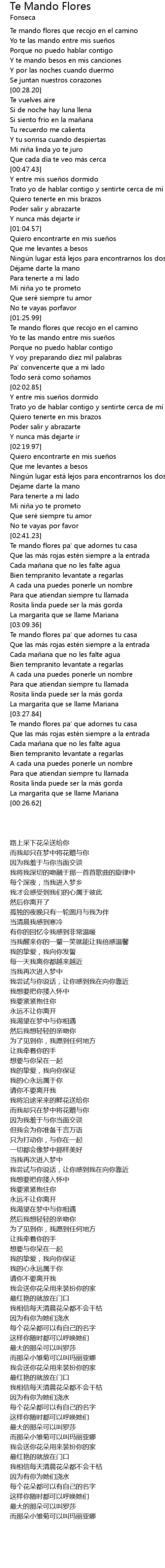 | [00:09.18] | Te mando flores que recojo en el camino |