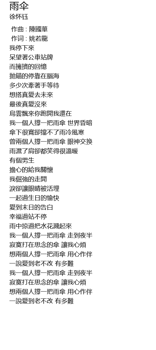 | [03:21.100] | 想兩個人撐一把雨傘 用心作伴 |