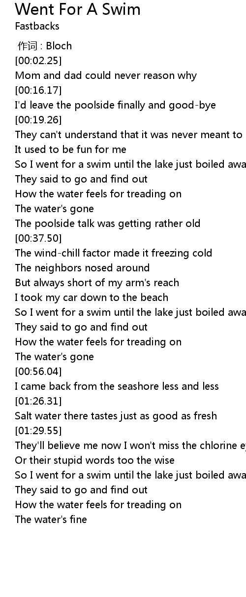 | [00:47.39] | So I went for a swim until the lake just boiled away |