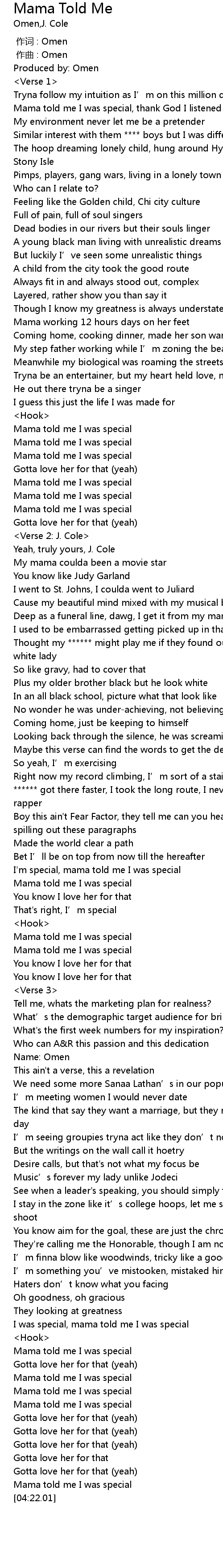 | [04:18.00] | Mama told me I was special |