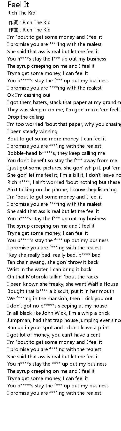 | [01:09.32] | I'm 'bout to get some money and I feel it |