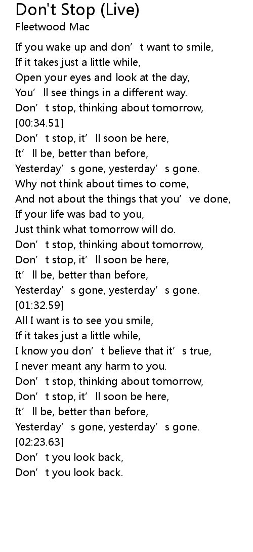 | [01:11.25] | Don’t stop, thinking about tomorrow, |