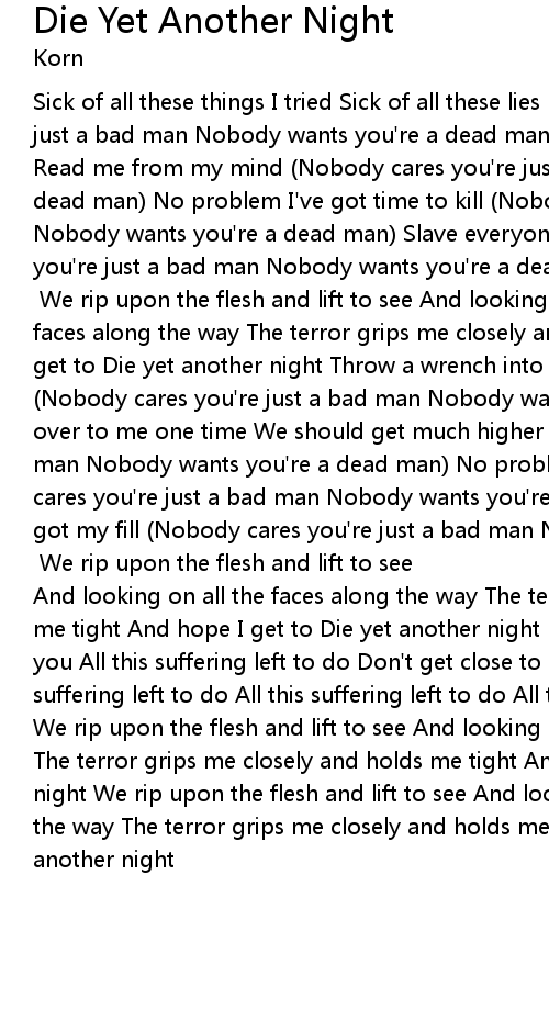 Sick of all these things I tried Sick of all these lies (Nobody cares you're just a bad man Nobody wants you're a dead man) Wake me from my darkest dream Read me from my mind (Nobody cares you're just a bad man Nobody wants you're a dead man) No problem I've got time to kill (Nobody cares you're just a bad man Nobody wants you're a dead man) Slave everyone I've had my fill (Nobody cares you're just a bad man Nobody wants you're a dead man) Do what you say, do want you want to [x4] We rip upon the flesh and lift to see And looking on all the faces along the way The terror grips me closely and holds me tight And hope I get to Die yet another night Throw a wrench into my world Throw me in the fire (Nobody cares you're just a bad man Nobody wants you're a dead man) Death come over to me one time We should get much higher (Nobody cares you're just a bad man Nobody wants you're a dead man) No problem I've got time to kill (Nobody cares you're just a bad man Nobody wants you're a dead man) Slave everyone I've got my fill (Nobody cares you're just a bad man Nobody wants you're a dead man) Do what you say, do want you want to [x4] We rip upon the flesh and lift to see And looking on all the faces along the way The terror grips me closely and holds me tight And hope I get to Die yet another night Don't get close to me Safe for you All this suffering left to do Don't get close to me Safe for you All this suffering left to do All this suffering left to do All this suffering left to do We rip upon the flesh and lift to see And looking on all the faces along the way The terror grips me closely and holds me tight And hope I get to Die yet another night We rip upon the flesh and lift to see And looking on all the faces along the way The terror grips me closely and holds me tight And hope I get to Die yet another night |