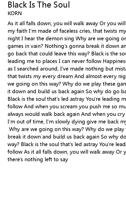 As it all falls down, you will walk away Or you will stand my ground and accept my faith I'm made of faceless cries, that twists my every dream And almost every night I hear the demon sing Why are we going on this way? Why do we play these games in vain? Nothing's gonna break it down and build us back again So why do go back that could leave this way? Black is the soul that's led astray You're leading me to places I can never follow Happiness is found in darkest ways And as I searched around, I've made nothing but mistakes I'm made of faceless cries, that twists my every dream And almost every night I hear the demon sing Why are we going on this way? Why do we play these games in vain? Nothing's gonna break it down and build us back again So why do go back that could leave this way? Black is the soul that's led astray You're leading me to places I can never follow And when you scream you push me so much further and And when I leave, I always would walk back again And when you cry the tears are cleansing bitterness I'm out of time, I'm slowly dying give me back my LIFE! Just give me back my life [x4] Why are we going on this way? Why do we play this game Nothing's gonna break it down and build us back again So why do go back that could leave this way? Black is the soul that's led astray You're leading me to places I can never follow As it all falls down, you will walk away Or you will stand my ground, there's nothing left to say |