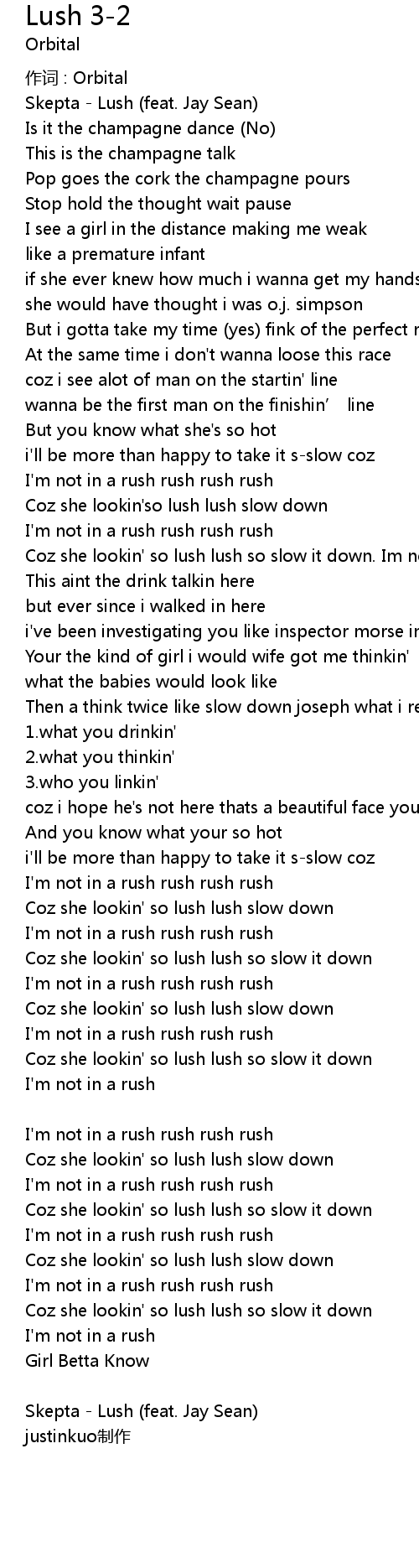 | Coz she lookin' so lush lush so slow it down. Im not in a rush | |