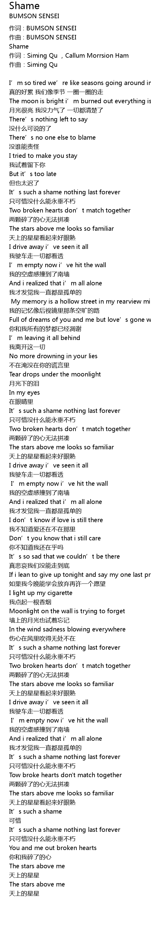 | 作词:Siming Qu ,Callum Morrsion Ham | |