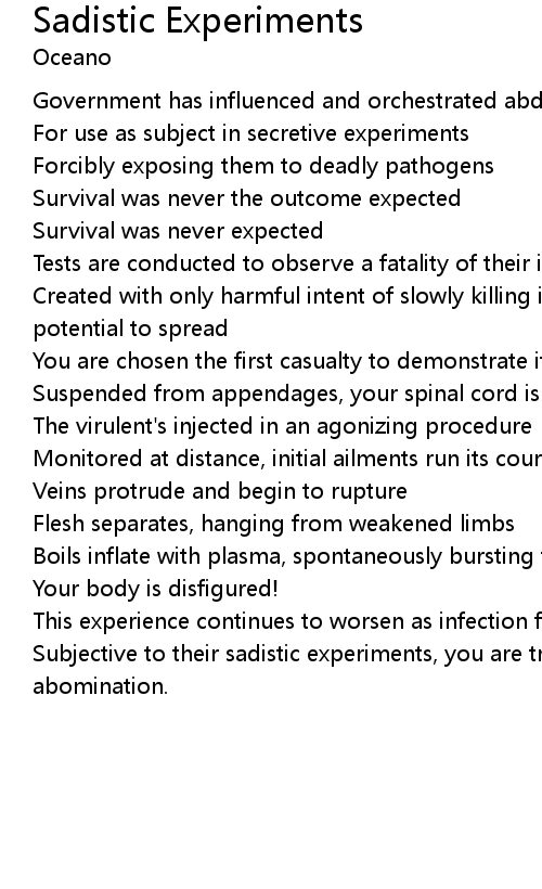 | Subjective to their sadistic experiments, you are transformed into a sight of abomination. |