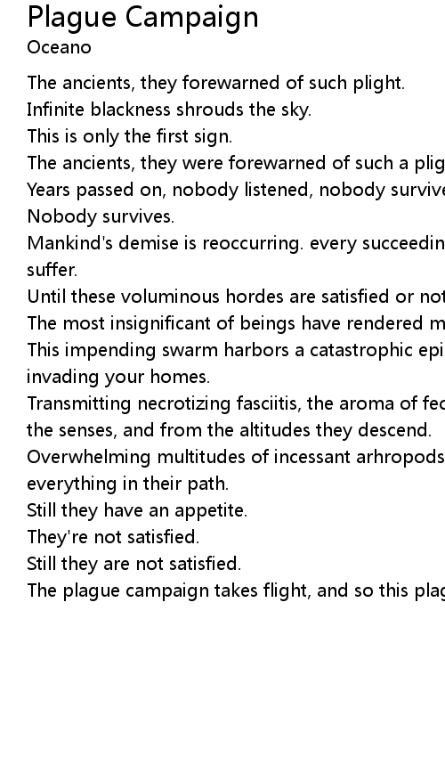 | This impending swarm harbors a catastrophic epidemic sweeping the coasts, invading your homes. | |