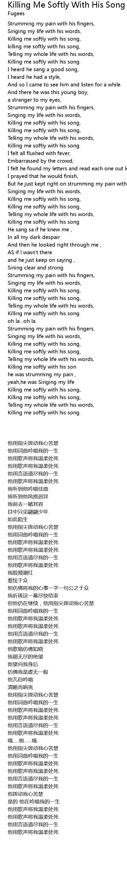 | [00:18.190] | killing me softly with his song, |