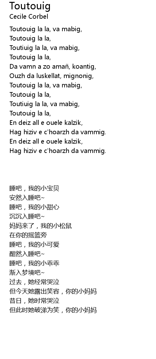 | [00:12.00] | Toutiuig la la, va mabig, |