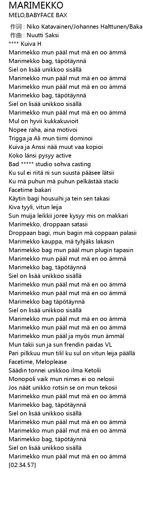 | [02:09.49] | Marimekko mun p l mut m en oo mm |