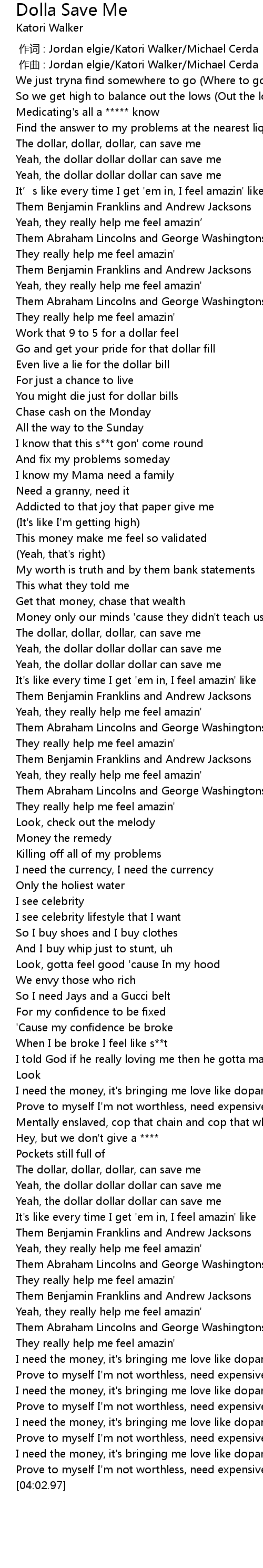 | [00:36.28] | The dollar, dollar, dollar, can save me |