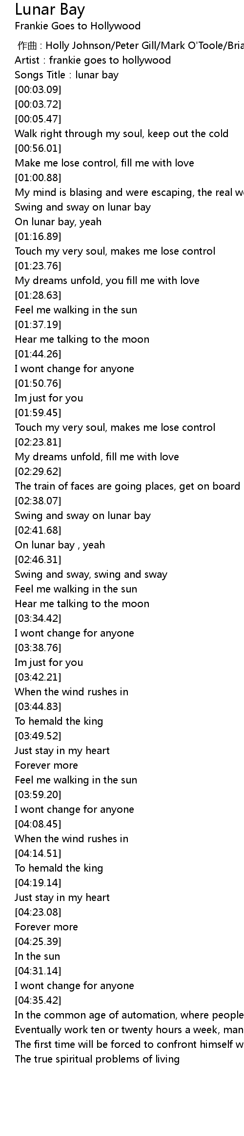 | [00:00.00] | zuo qu : Holly Johnson Peter Gill Mark O' Toole Brian Nash |