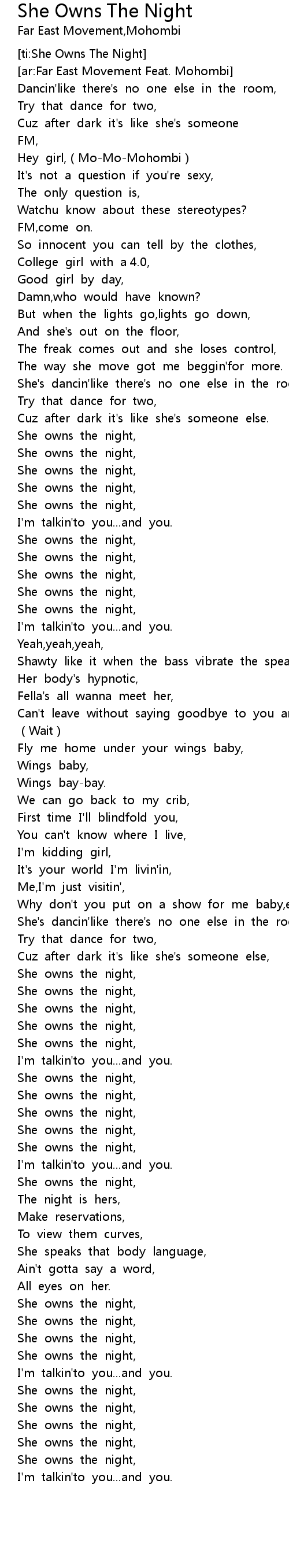 | [01:09.15] | Cuz after dark it's like she's someone else. |