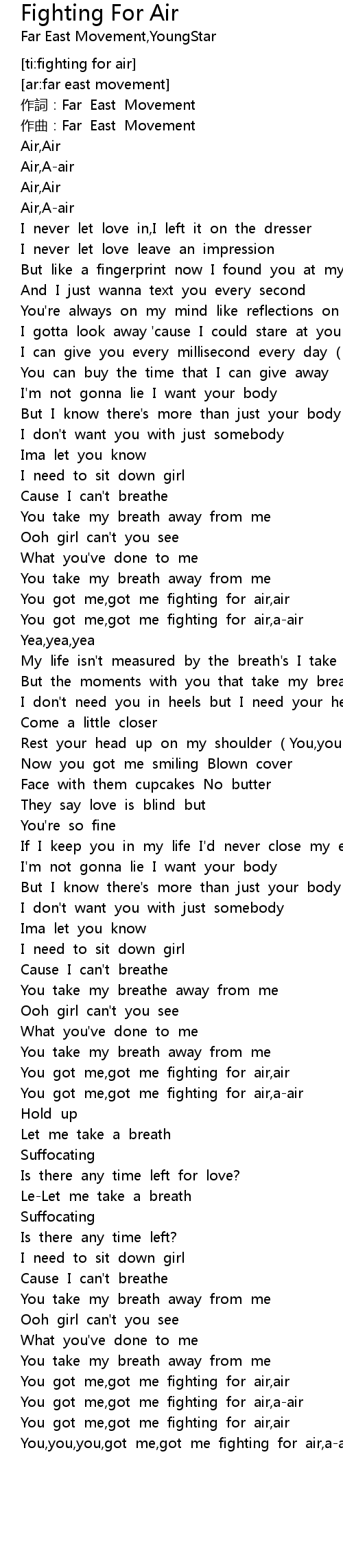 | [02:33.70] | You got me, got me fighting for air, aair |