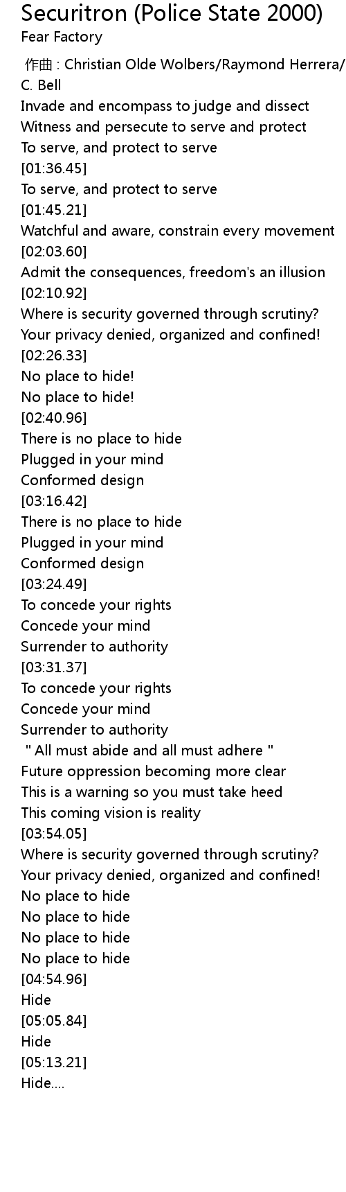 | [04:17.90] | Your privacy denied, organized and confined! |