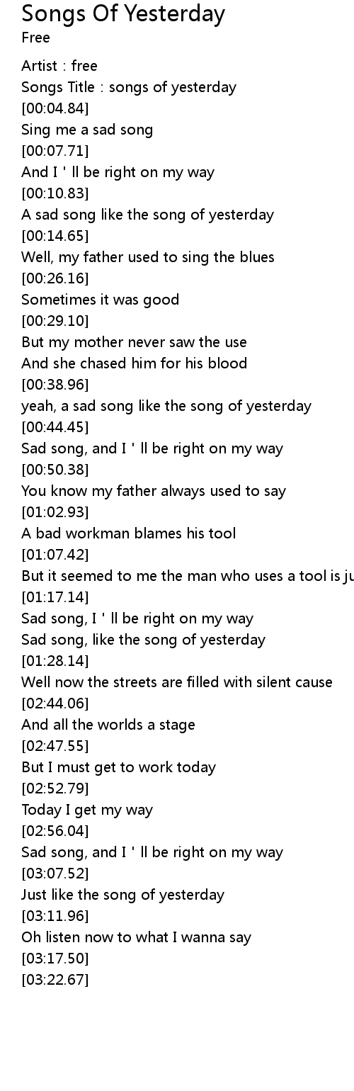 | [00:40.33] | yeah, a sad song like the song of yesterday |