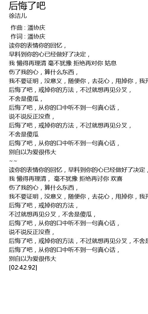 | [00:57.57] | 后悔了吧,戒掉你的方法,不过就想再见分叉, |
