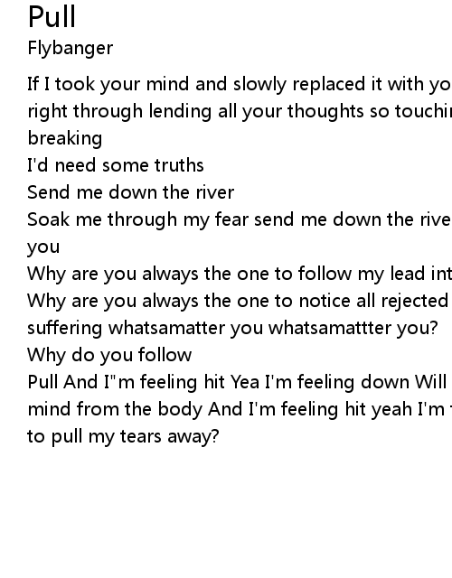Pull And I"m feeling hit Yea I'm feeling down Will you be the one to pull my mind from the body And I'm feeling hit yeah I'm feeling down Will you be the one to pull my tears away? |