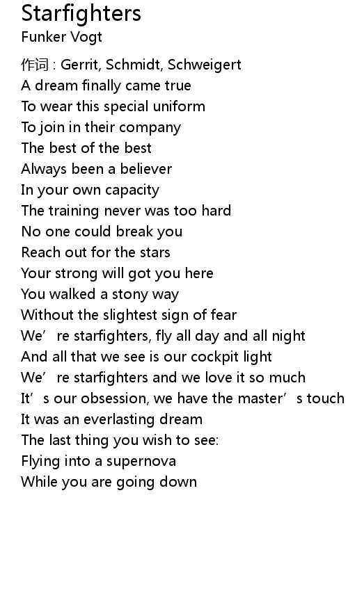 | We' re starfighters, fly all day and all night | |