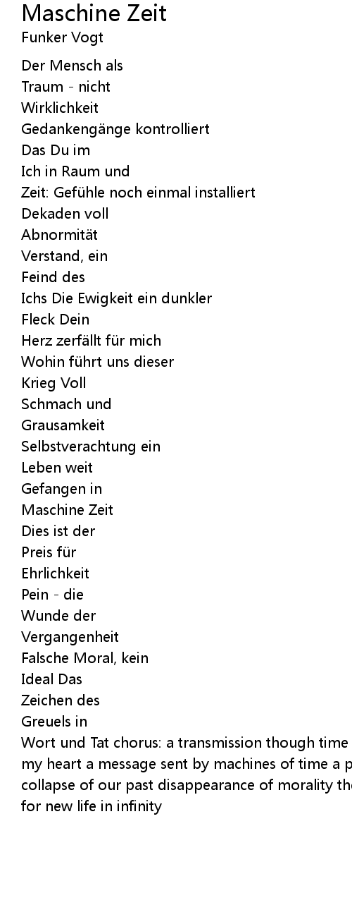 | Wort und Tat chorus: a transmission though time and space right into the core of my heart a message sent by machines of time a prophecy of a new start the total collapse of our past disappearance of morality the old time tunnel will explode for new life in infinity |