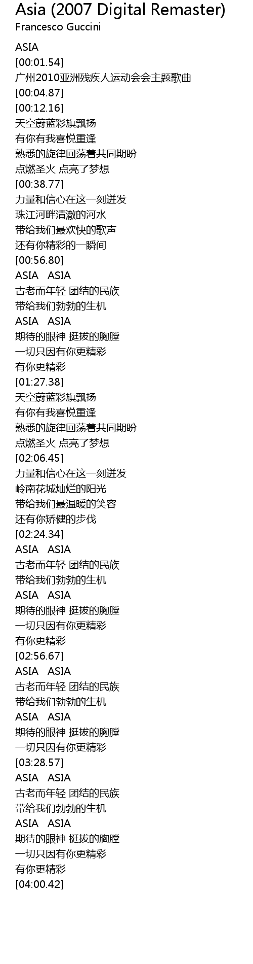 | [00:03.33] | 广州2010亚洲残疾人运动会会主题歌曲 |