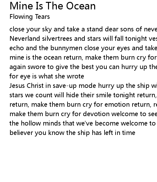 Jesus Christ in save-up mode hurry up the ship will leave in time and all the stars we count will hide their smile tonight return, return mine is the ocean return, make them burn cry for emotion return, return mine is the ocean return, make them burn cry for devotion welcome to see the dark behind wake up to see the hollow minds that we've become welcome to watch your life welcome my sole believer you know the ship has left in time |