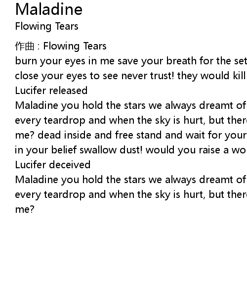 | Maladine you hold the stars we always dreamt of never leave you are the salt in every teardrop and when the sky is hurt, but there' s no pain say will you leave me? dead inside and free stand and wait for your miracle sell your misery sleep in your belief swallow dust! would you raise a word? | |