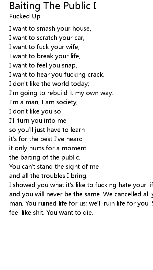 I showed you what it's like to fucking hate your life now you see things like me and you will never be the same. We cancelled all your plans, you want to give up man. You ruined life for us; we'll ruin life for you. Shout, cry asking why you feel like shit. You want to die. |