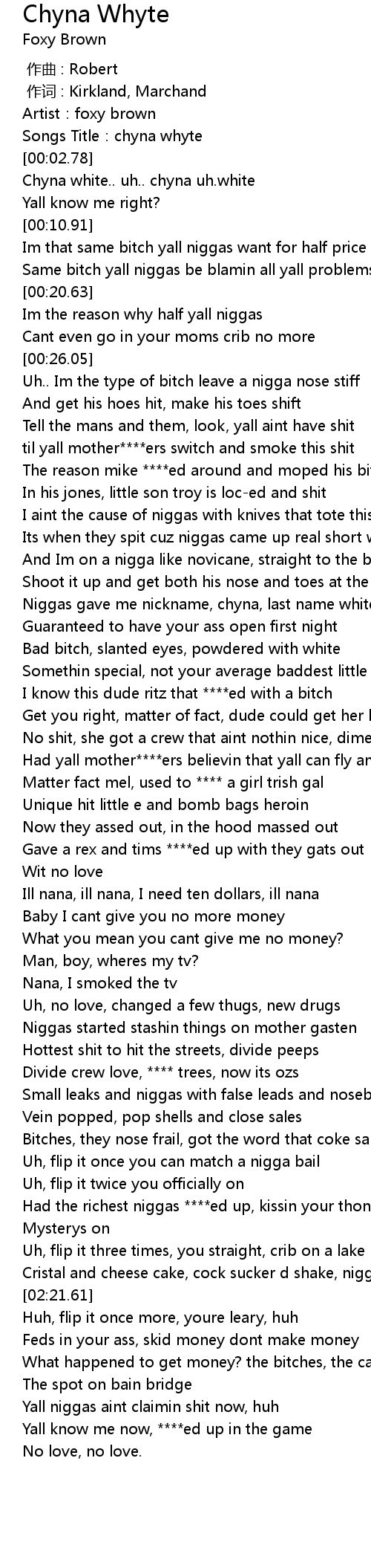 | [00:58.42] | Niggas gave me nickname, chyna, last name white |