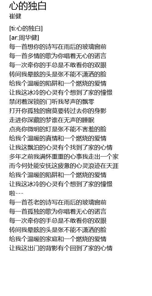 | [03:35.932] | 每一首孤独的歌为你唱着无心的诺言 |