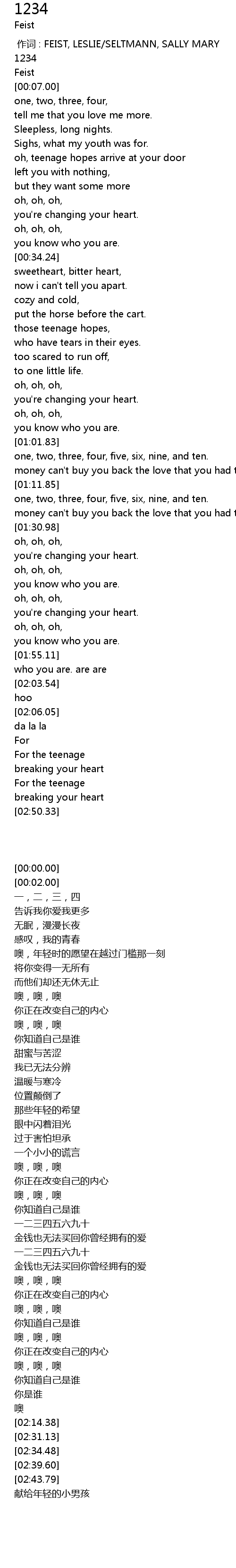 | [00:00.00] | 作词 : FEIST, LESLIE/SELTMANN, SALLY MARY |