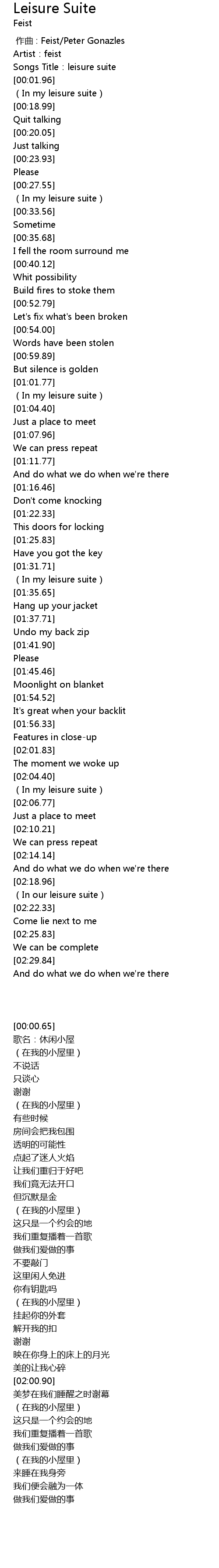 | [00:00.00] | 作曲 : Feist/Peter Gonazles |