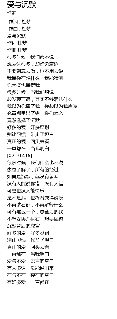 | [00:15.152] | 爱与沉默 |