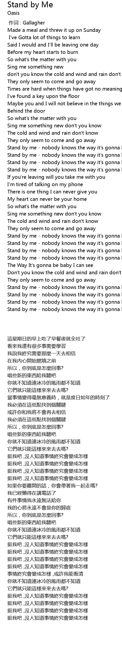 | [02:02.420] | Stand by me nobody knows the way it' s gonna be |