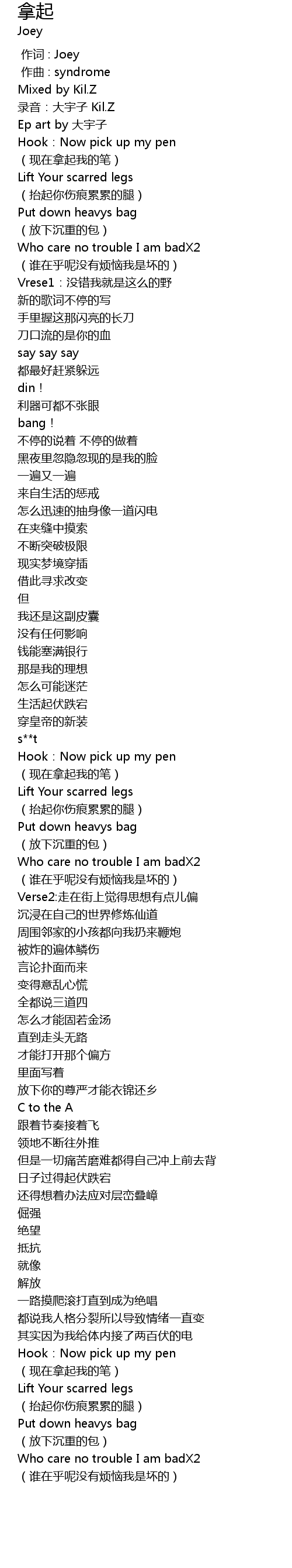 | [01:53.367] | xiàn zài ná qǐ wǒ de bǐ |