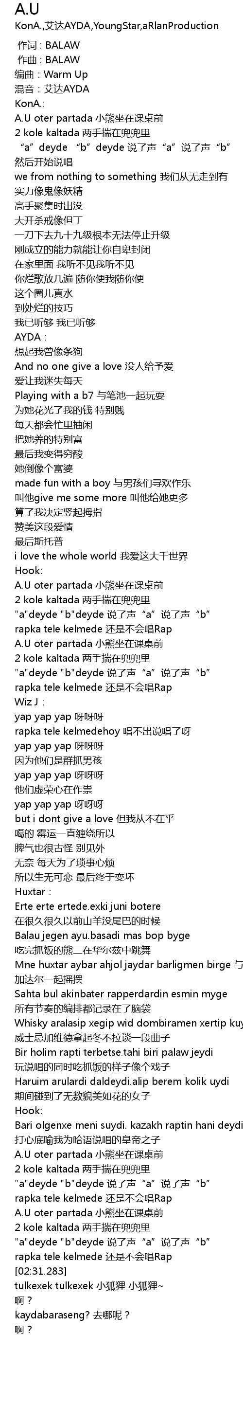 | [02:02.447] | Bir holim rapti terbetse.tahi biri palaw jeydi 玩说唱的同时吃抓饭的样子像个戏子 |