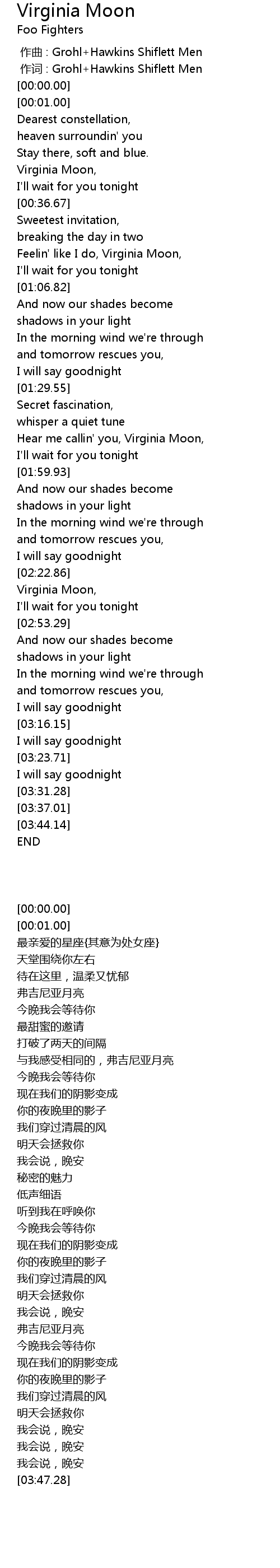 | [00:54.20] | Feelin' like I do, Virginia Moon, |