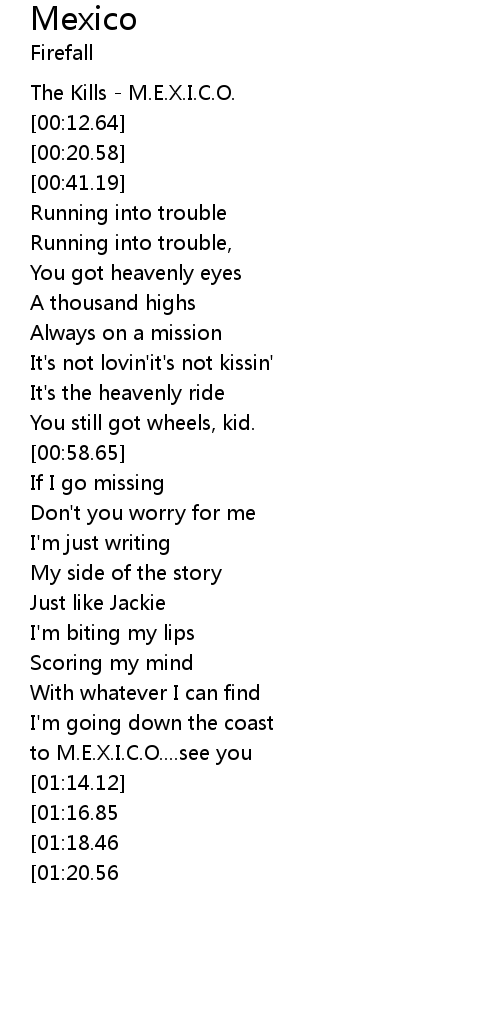 | [01:33.77][01:18.46] | to M.E.X.I.C.O....see you. |