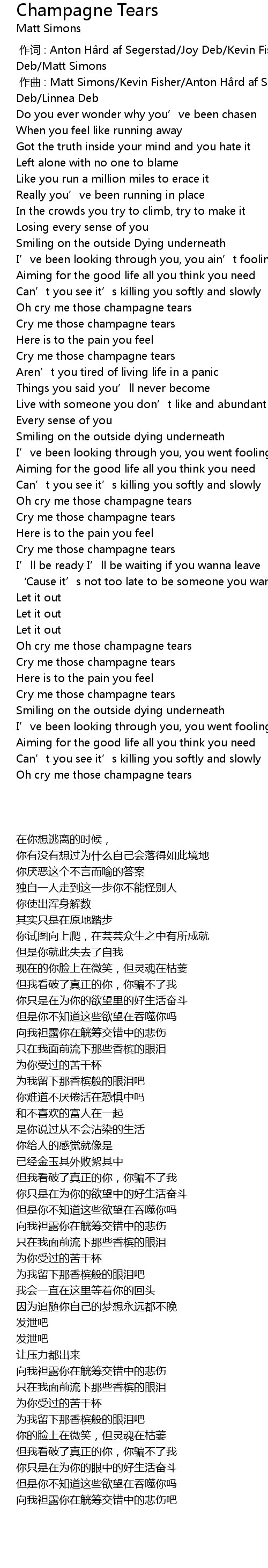 | [00:01.000] | 作曲 : Matt Simons/Kevin Fisher/Anton Hård af Segerstad/Joy Deb/Linnea Deb |