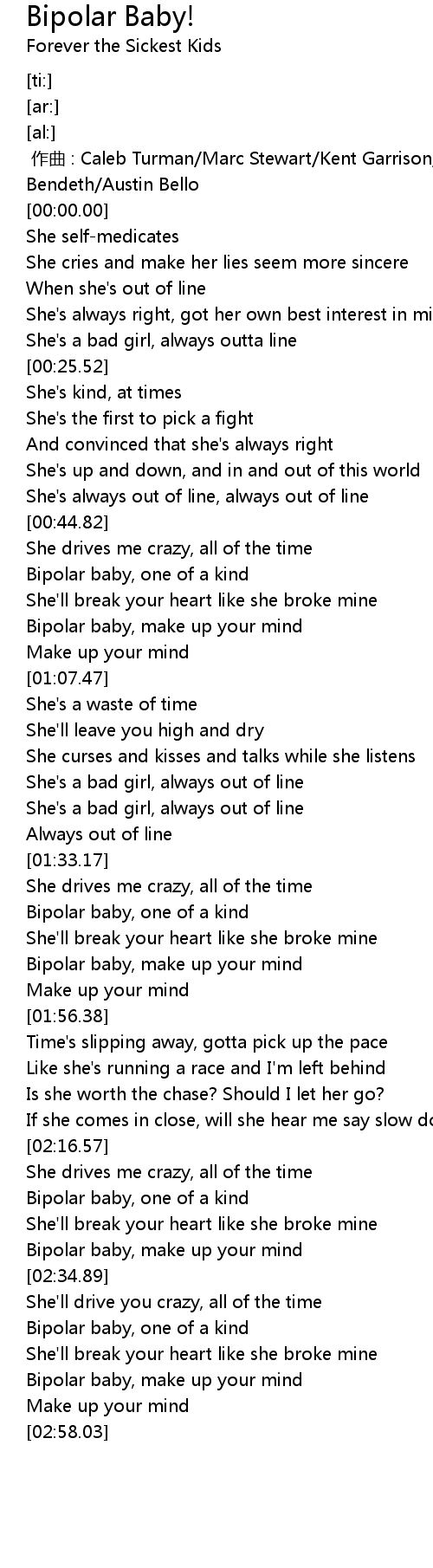 | [00:49.31] | Bipolar baby, one of a kind |