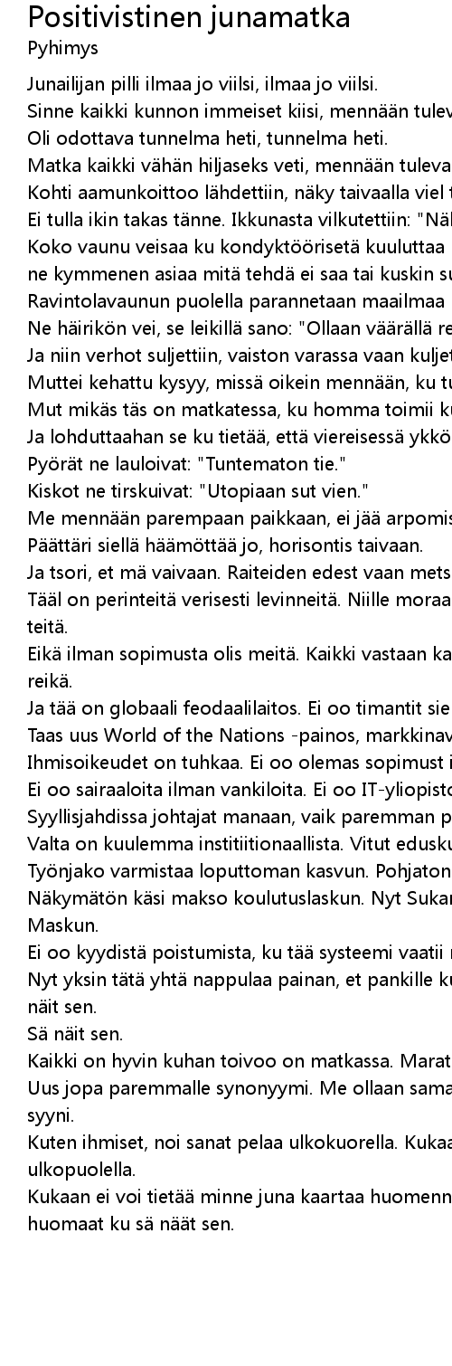 | Ei tulla ikin takas t nne. Ikkunasta vilkutettiin: " N kemiin." | |