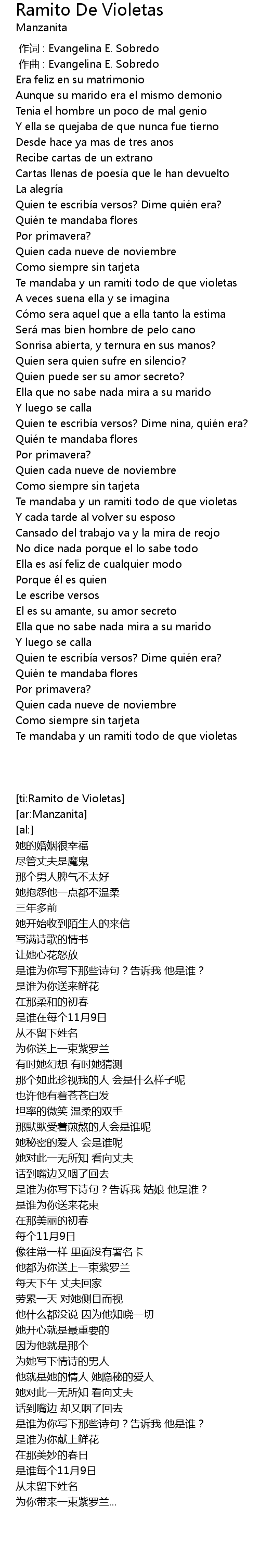 | [04:16.67] | Te mandaba y un ramiti todo de que violetas |