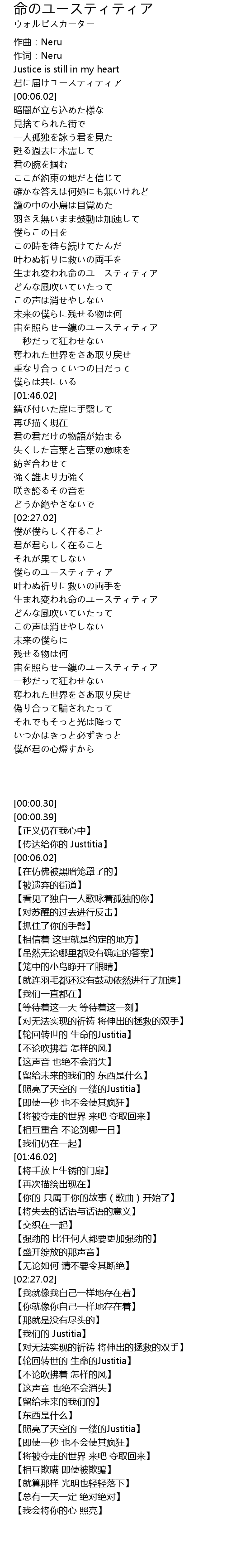 | [01:26.66] | 宙を照らせ一縷のユースティティア |